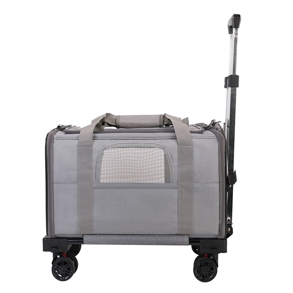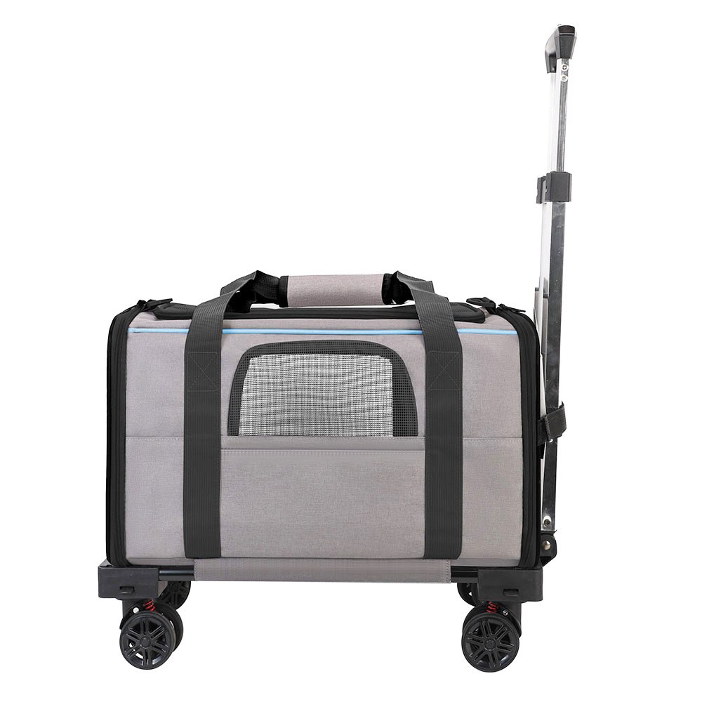 Made from durable Oxford fabric with reinforced panels, the carrier maintains its shape while remaining lightweight. The stable wheeled base and telescopic aluminum handle provide smooth movement on sidewalks and indoor surfaces. Multiple mesh windows ensure proper ventilation and visibility for pets.
