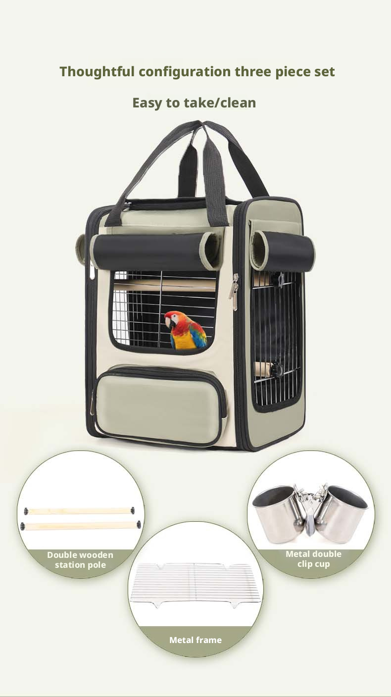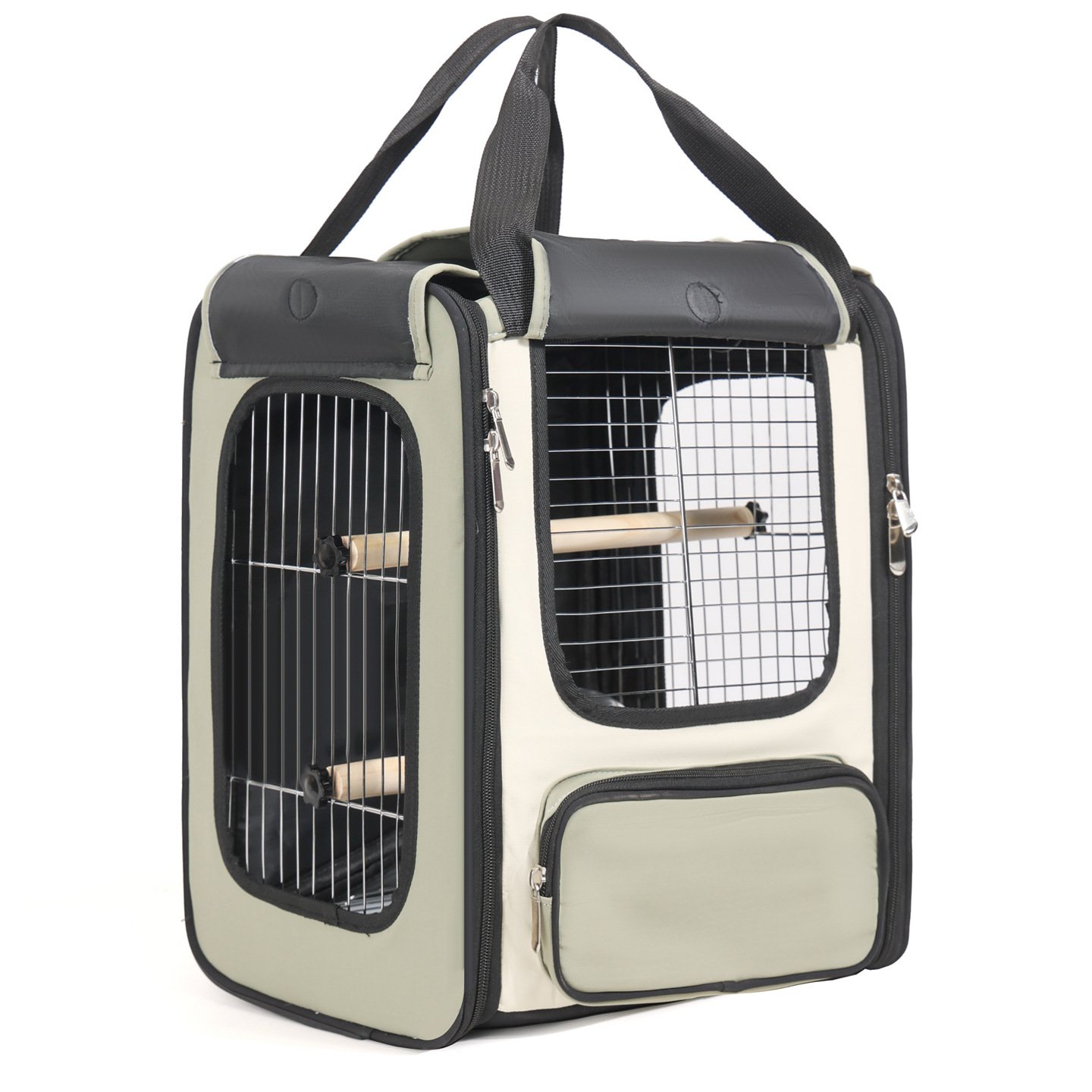 This durable, lightweight bird carrier offers a safe and comfortable travel solution for parrots and small birds.It features dual breathable mesh windows, built-in wooden perches, and multi-way carry options (backpack/handbag/shoulder bag).With secure zipper locks and a convenient storage pocket, it’s perfect for vet visits, outdoor adventures, and daily commutes.We welcome wholesale orders and offer OEM/ODM customization to support your business.